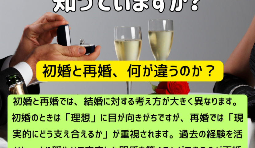 結婚を考えるとき、初婚と再婚では心の持ち方や考え方に違いがあります。初婚は「新しい人生のスタート」、再婚は「過去の経験を活かし、よりよい未来を築くもの」です。佐賀県佐賀市の結婚相談所「縁cafe(えんかふぇ)」では、再婚を前向きに考える方をサポートしています。今回は、再婚だからこそ幸せになれる理由を詳しく解説します。