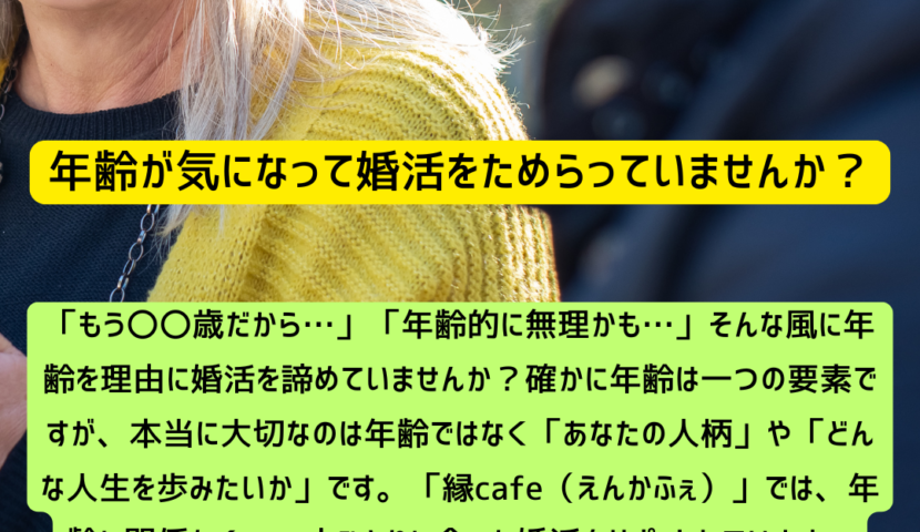 結婚は「年齢が若いかどうか」ではなく、「どれだけ前向きに、幸せな関係を築けるか」が大切です。年齢に縛られるのではなく、自分に合うお相手を見つけることが、幸せな結婚への近道です。「縁cafe(えんかふぇ)」では、年齢を理由に婚活を諦めるのではなく、前向きな気持ちでご縁を大切にする方を応援しています。