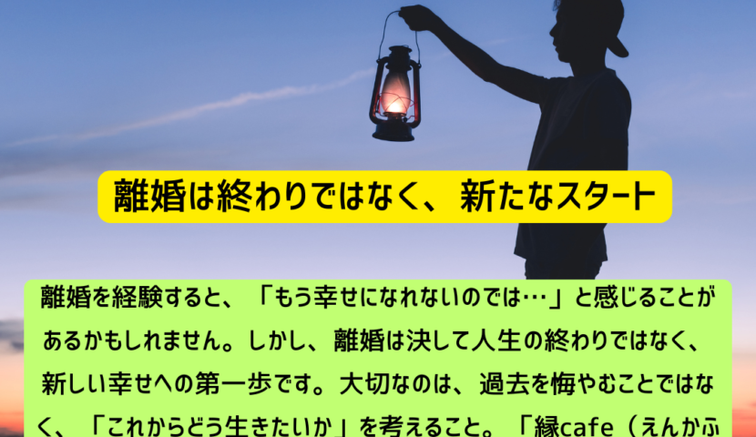 離婚は、決して人生の失敗ではありません。価値観の違いやさまざまな事情で夫婦関係が終わることは、誰にでも起こりうることです。大切なのは、過去を後悔することではなく、「これからの人生をどう生きるか」を考えること。離婚を乗り越えたからこそ、新たな幸せを築くチャンスがあります。「縁cafe(えんかふぇ)」では、過去を前向きに捉え、新しいご縁を見つけるお手伝いをしています。