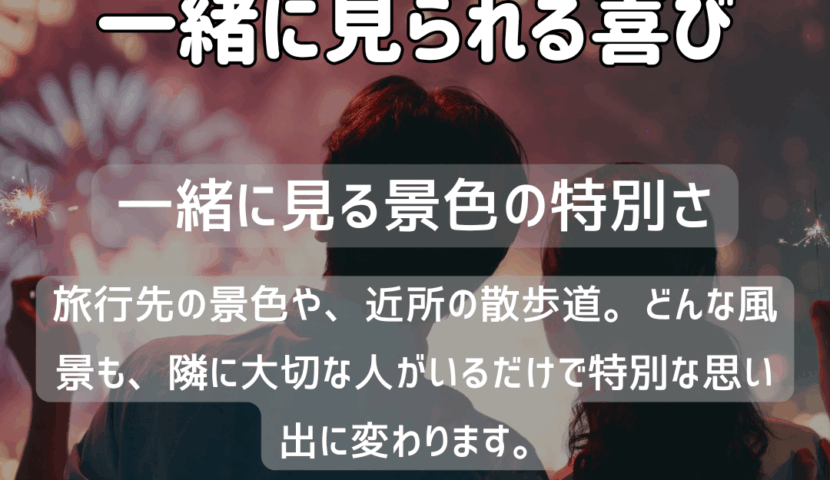 美しい景色を前にすると、自然と会話が生まれます。感じたことを伝え合うことで、相手への理解が深まり、心の距離も縮まります。共に時間を過ごす中で生まれる会話は、関係を豊かにする大切な要素です。