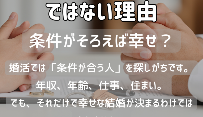 結婚は、条件の一致で完成するものではありません。出会った二人が、お互いを理解しながら関係を育てていくものです。最初から完璧な関係があるわけではなく、時間をかけて信頼を築いていきます。その過程を大切にできる相手こそ、人生のパートナーとしてふさわしい存在になるのです。婚活では「条件が合う人」よりも「関係を育てられる人」を見つけることが重要です。